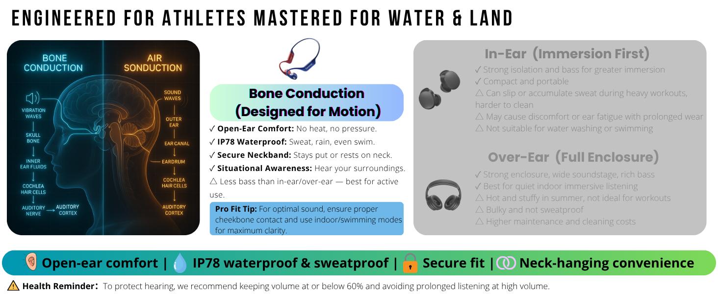 - 【Crafted for Water, Inspired by Freedom】 Conceived with professional swimmers in mind. Seamless panoramic sound, uncompromising IP78 waterproofing, and built-in 32GB memory transform every swim into an effortless escape.